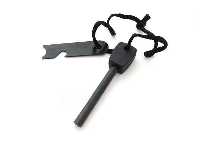 Zestaw posiada krzesiwo magnezowe o średnicy 8 mm, oraz metalową blaszkę wyposażoną w otwieracz do kapsli oraz miarkę.