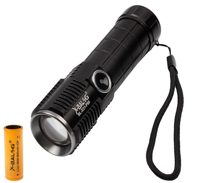Zestaw zawiera: latarkę X-BALOG BL-X31-P90 L-091, akumulator litowo-jonowy 26650, kabel USB, smycz na rękę, pudełko.