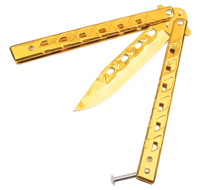 Nóż motylkowy w wypasionym, złotym kolorze to trafny wybór dla każdego fana!