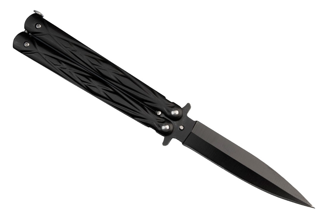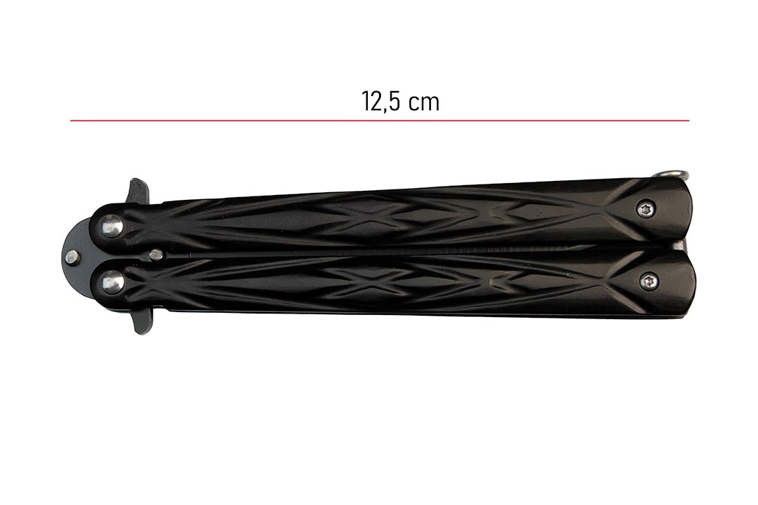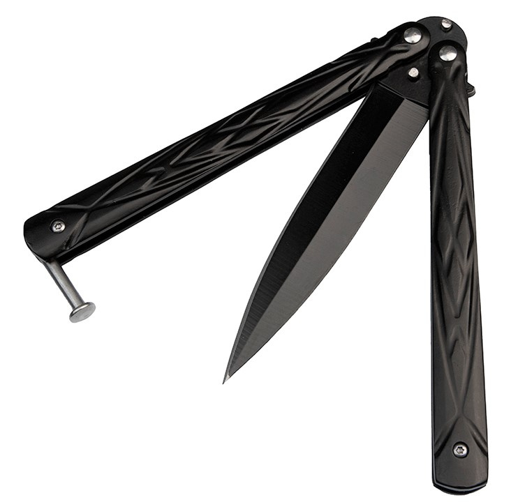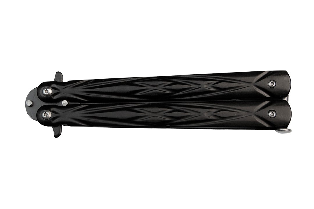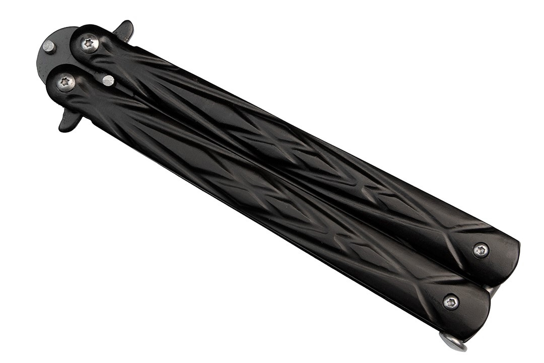 Czarny nóż motylkowy posiada standardową rękojeść złożoną z dwóch metalowych części, które w pozycji zamkniętej ochraniają ostrze.