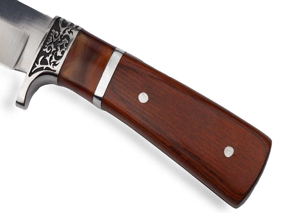 Został on wyposażony w metalowy, zdobiony jelec, który skutecznie chroni rękę przed zsunięciem się w stronę krawędzi tnącej.