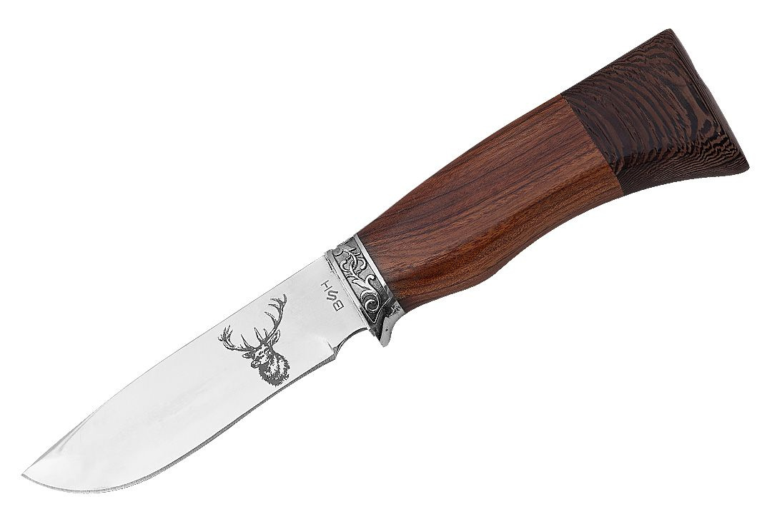 Rękojeść posiada delikatny, zdobiony myśliwskimi ornamentami jelec, który zapobiega zsunięciu się dłoni na krawędź tnącą.