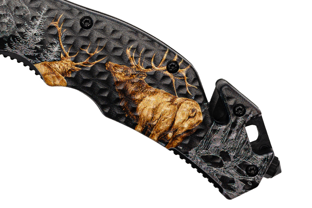 Na antypoślizgowej rękojeści znajduje się myśliwski nadruk z jeleniami.