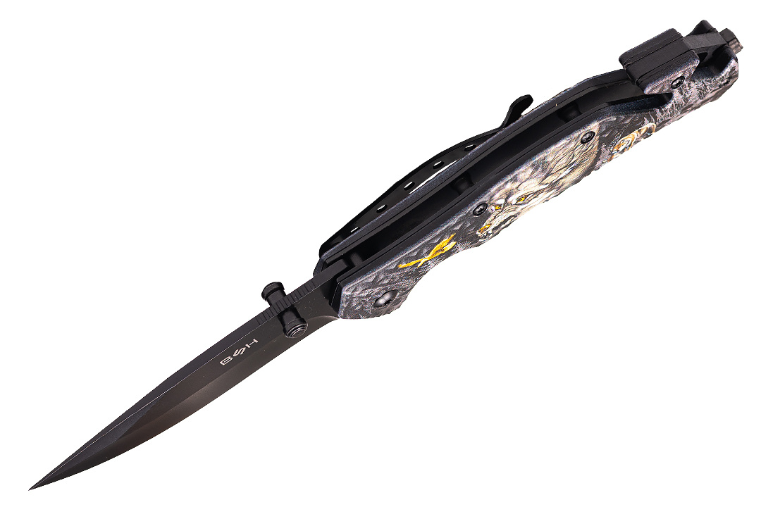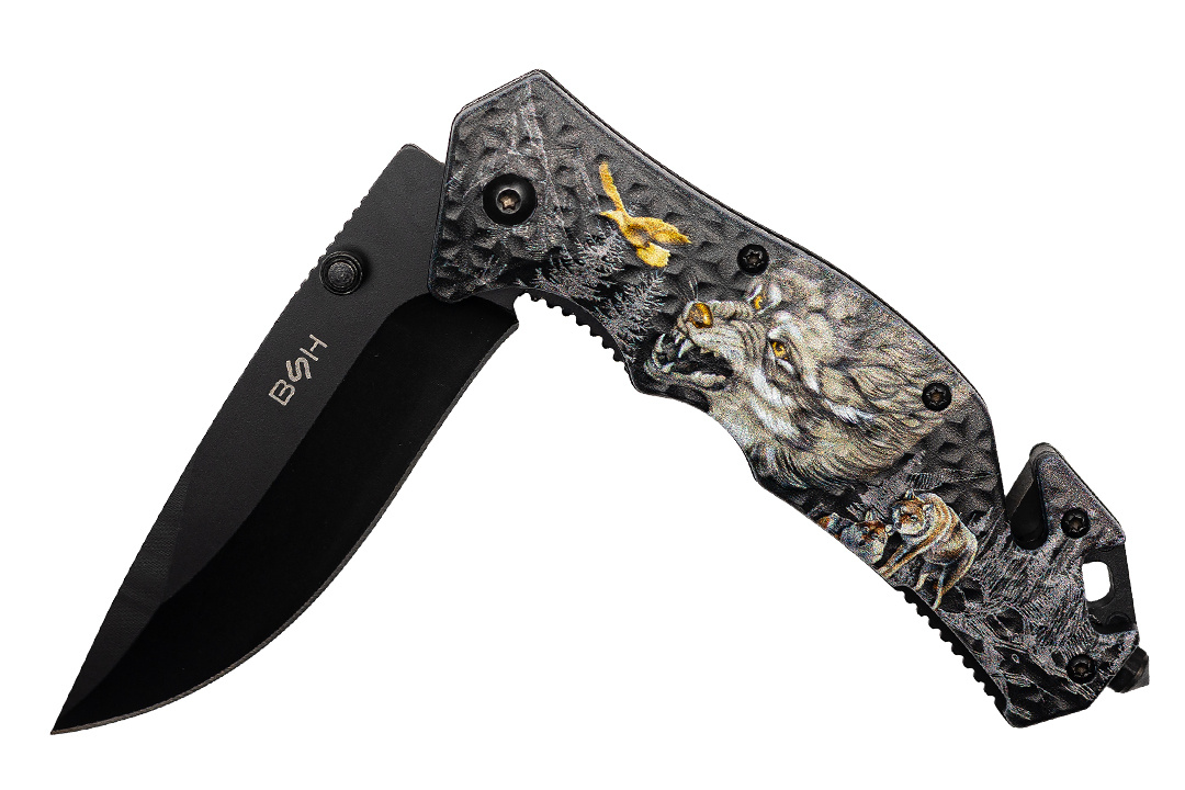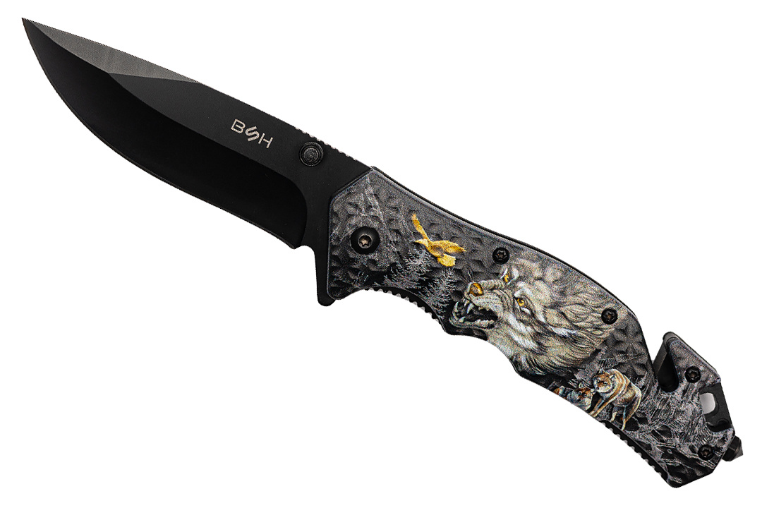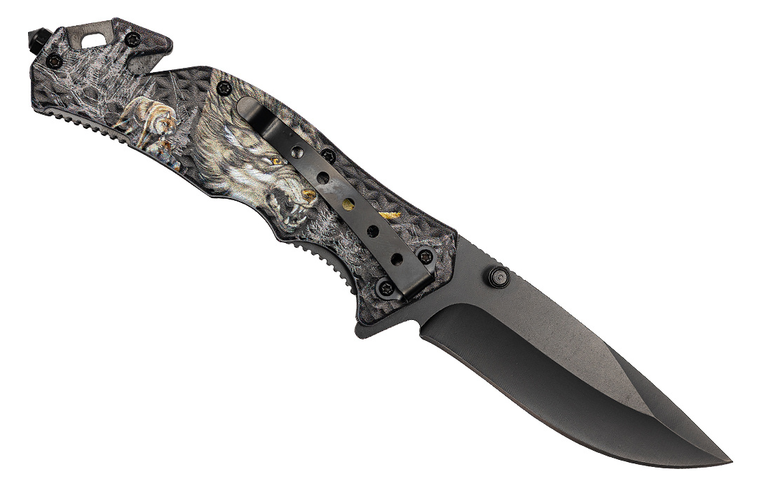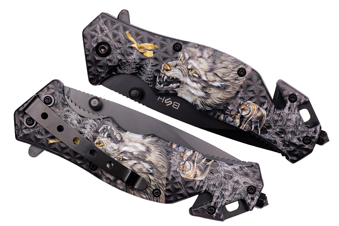 NÓŻ RATOWNICZY BSH ADVENTURE Z WIZERUNKIEM WILKA NA RĘKOJEŚCI N-353D