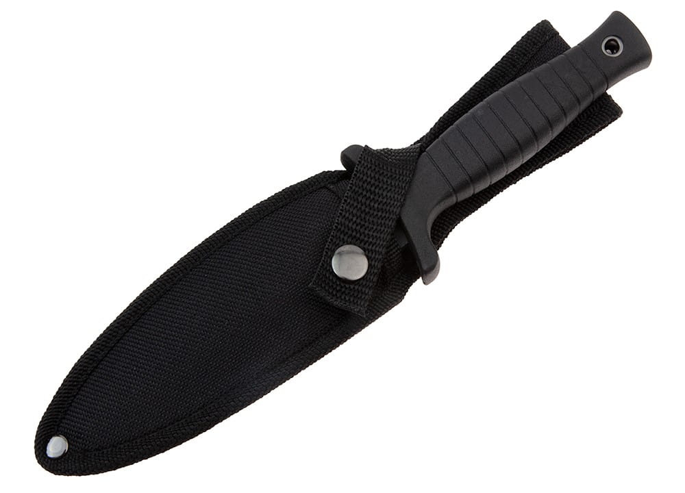 Czarny nóż do rzucania posiada w zestawie pokrowiec z klipsem do przymocowania go do paska spodni.