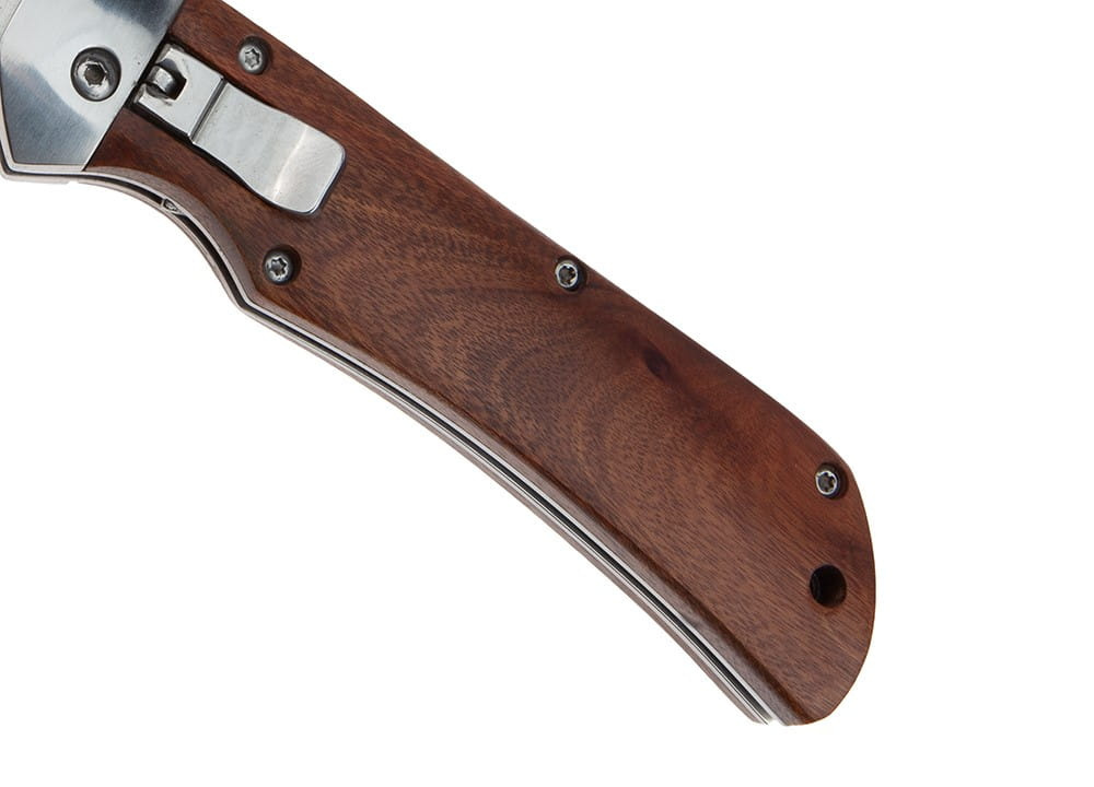 Ergonomiczna rękojeść ze stali obłożonej drewnem zapewnia pewny i komfortowy chwyt.