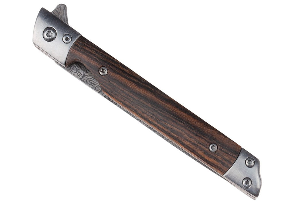 Nóż sprężynowy posiada wydłużoną głownię o profilu clip point wykonaną ze stali nierdzewnej 420.
