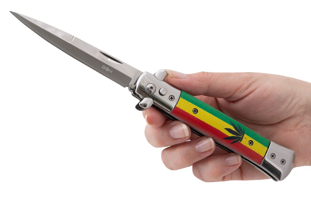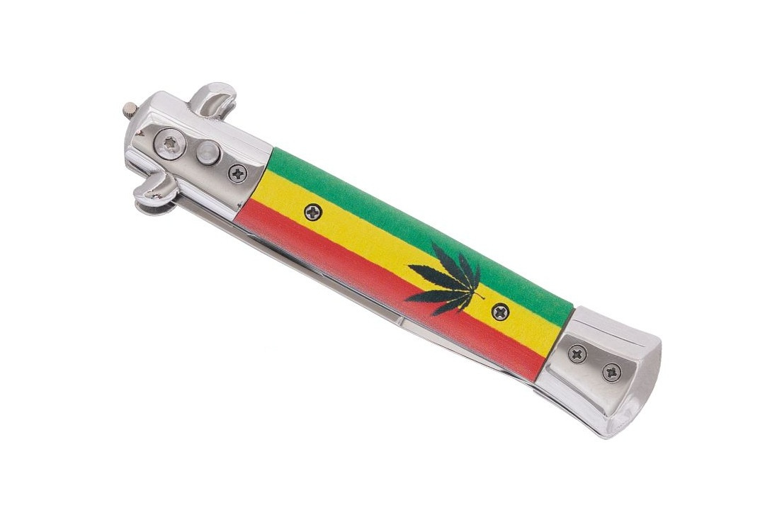 Kultowy nóż sprężynowy typu sycylijka z okładzinami w kolorach rasta.