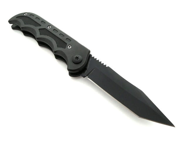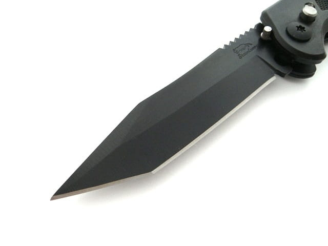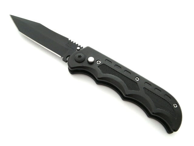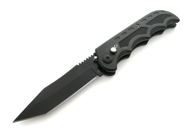 Klasyczny, czarny nóż automatyczny posiada głownię o oryginalnym profilu typu tanto wykonaną z wysokogatunkowej stali nierdzewnej numer 420