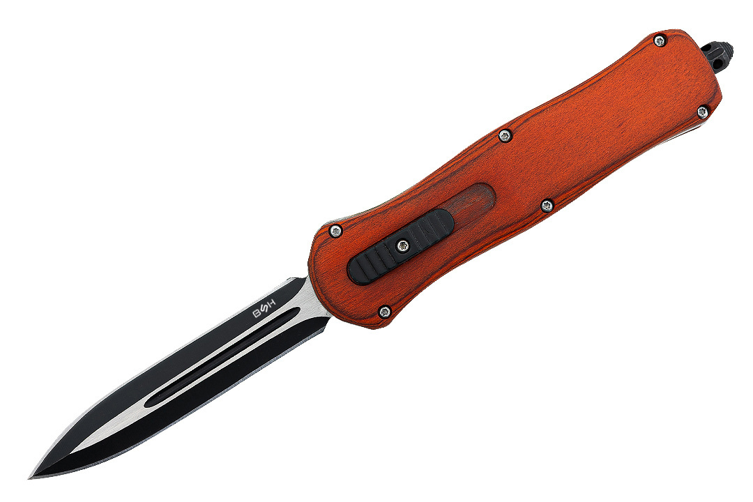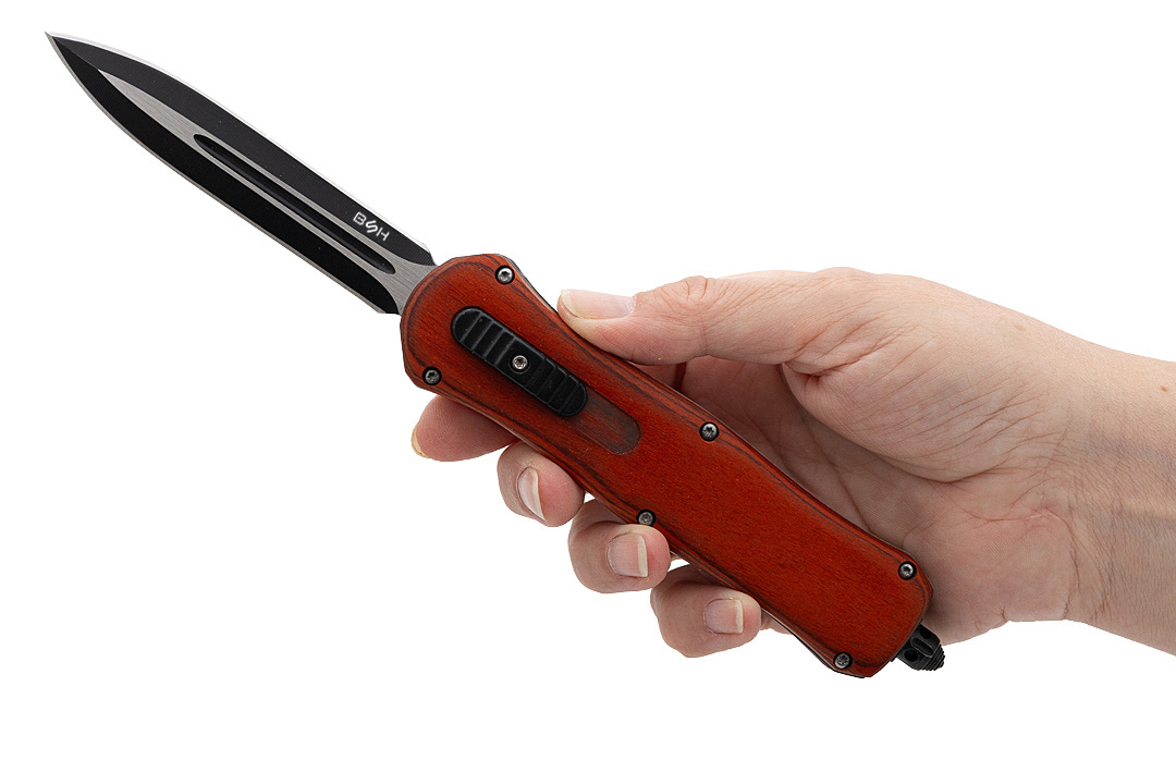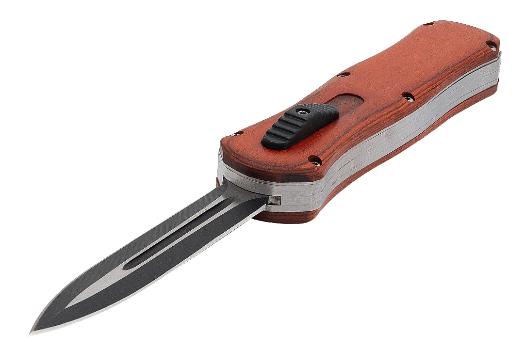 Model OTF-1 charakteryzuje się ostrzem, które automatycznie wysuwa się i chowa w rękojeści, zapewniając wygodę i szybkość działania. Nóż posiada głownię typu dagger (sztylet) o podwójnym ostrzu, idealną do precyzyjnych cięć. Dodatkowo, stylowe czernienie nadaje mu oryginalny i nowoczesny wygląd.