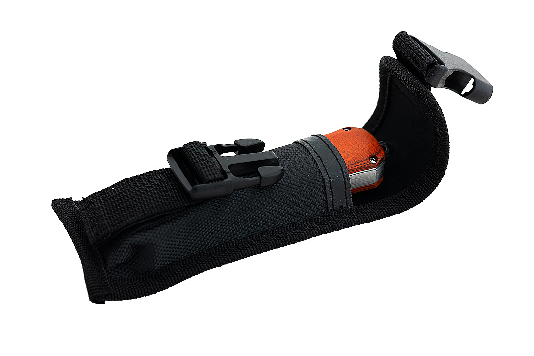 Drewniana rękojeść jest elegancka i ergonomiczna, zapewniając pewny chwyt i komfort użytkowania. Duży klips umożliwia łatwe przypięcie noża do pasa czy kieszeni, a wybijak przydaje się w sytuacjach awaryjnych.
