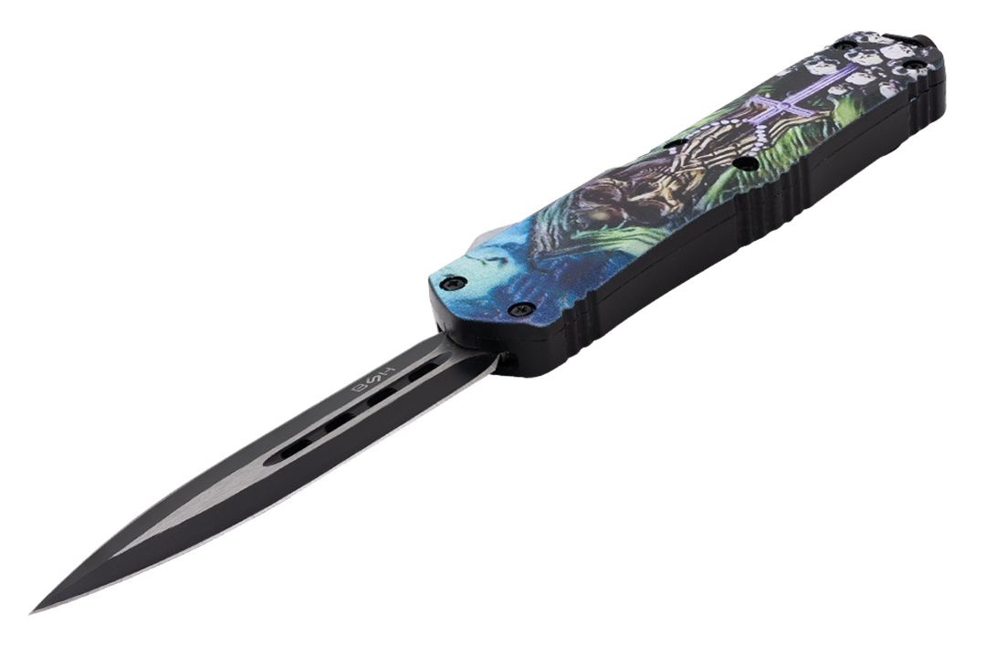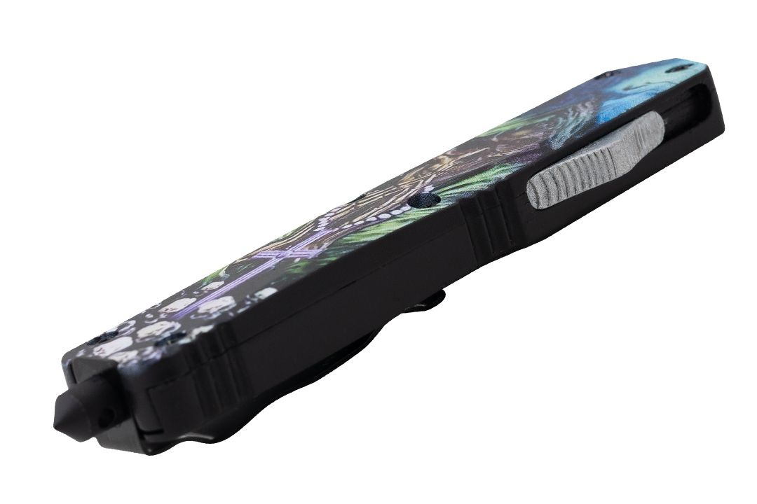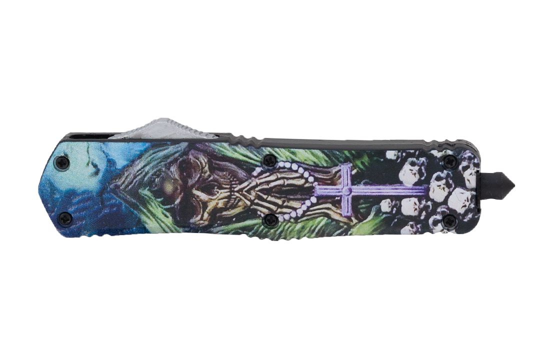 Aluminiowa rękojeść z motywem Śmierci gwarantuje trwałość oraz solidny uchwyt, a jednocześnie dodaje nożowi wyjątkowego, charakterystycznego wyglądu.