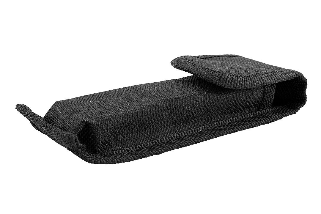 W zestawie znajduje się gruby, wytrzymały, czarny pokrowiec z cordury zapinany na rzep. Dodatkowo pokrowiec wyposażono w szlufkę, która umożliwia wygodne i bezpieczne przymocowanie go do pasa spodni.