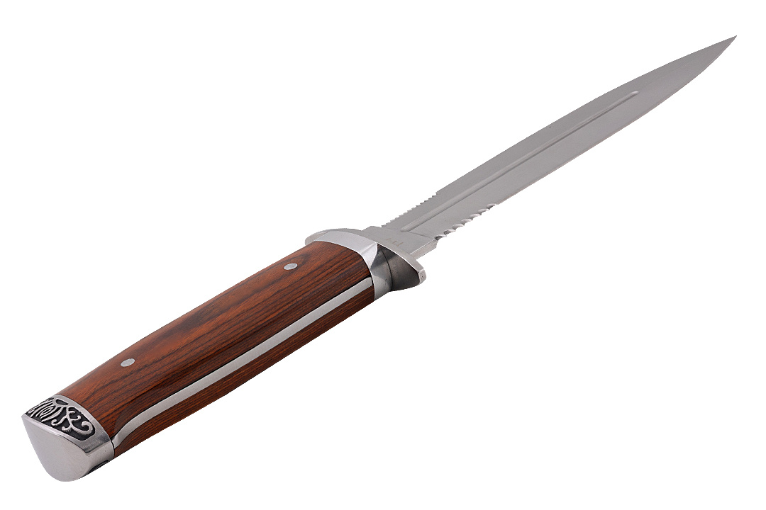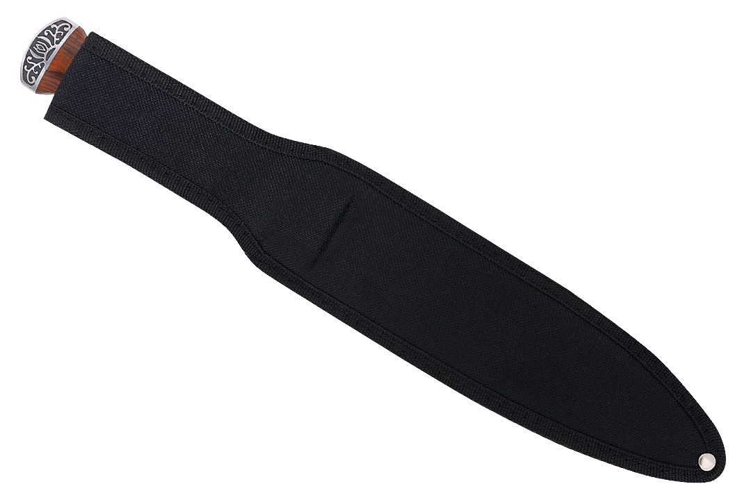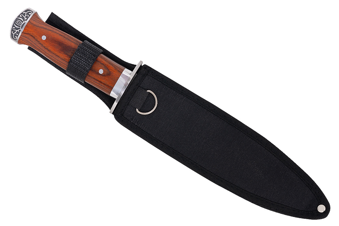 Metalowa głowica noża jest pięknie grawerowana, a w razie ostateczności można nią zadawać ciosy.