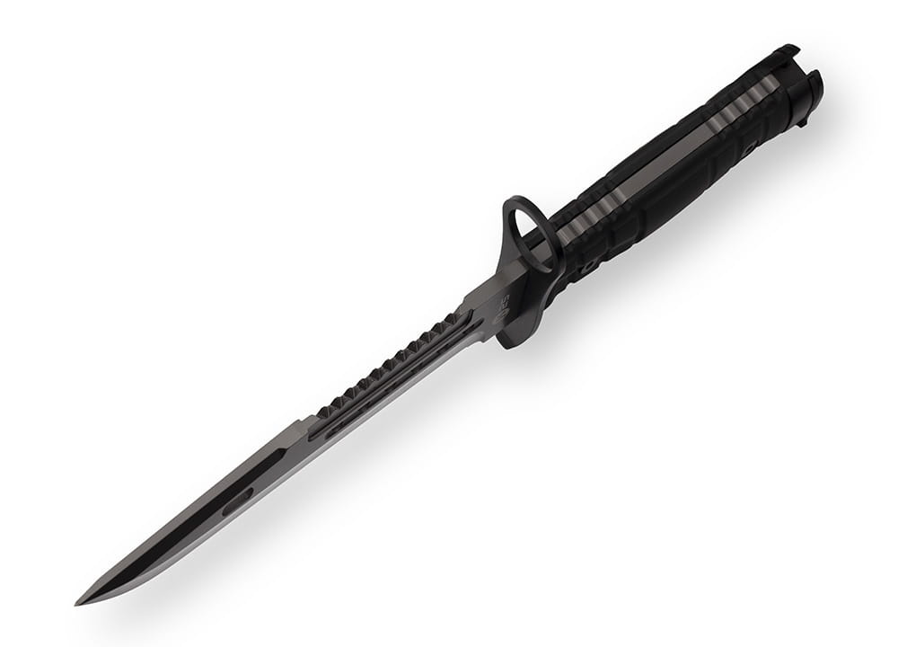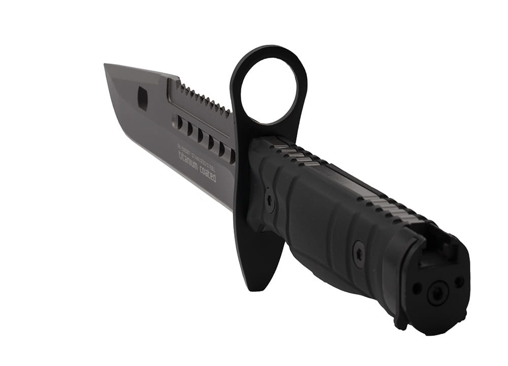 Nóż został wyposażony w mechanizm zapinający oraz pierścień na lufę, by pełnić także funkcję bagnetu bojowego.