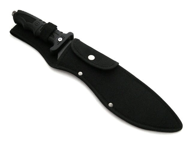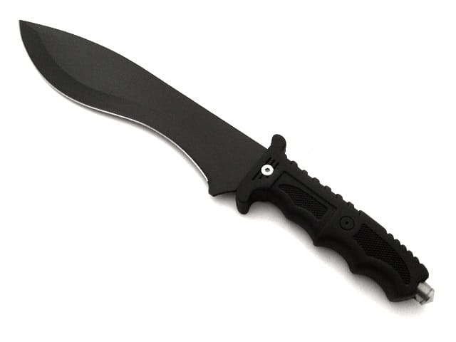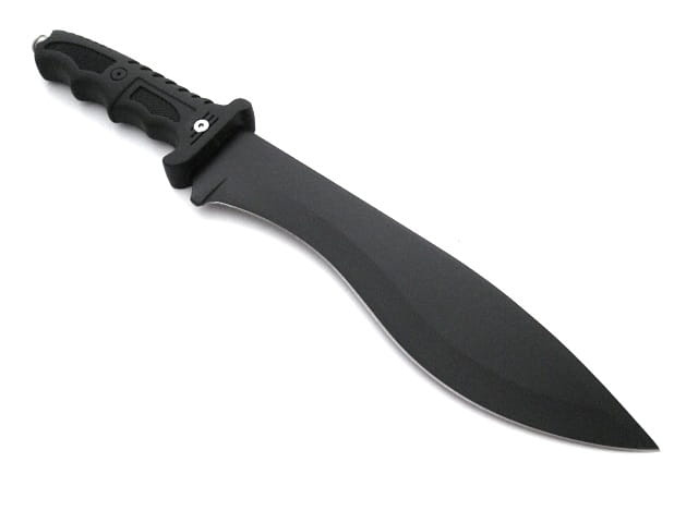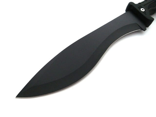 Potężny, czarny nóż taktyczny którego kształt wzorowany jest na tradycyjnych maczetach kukri.