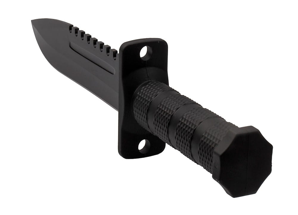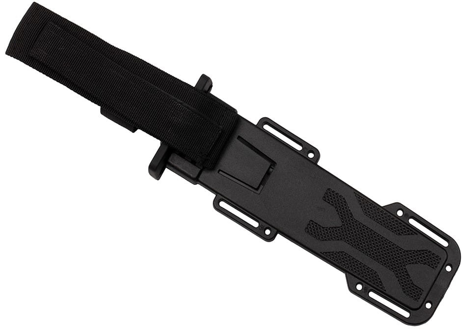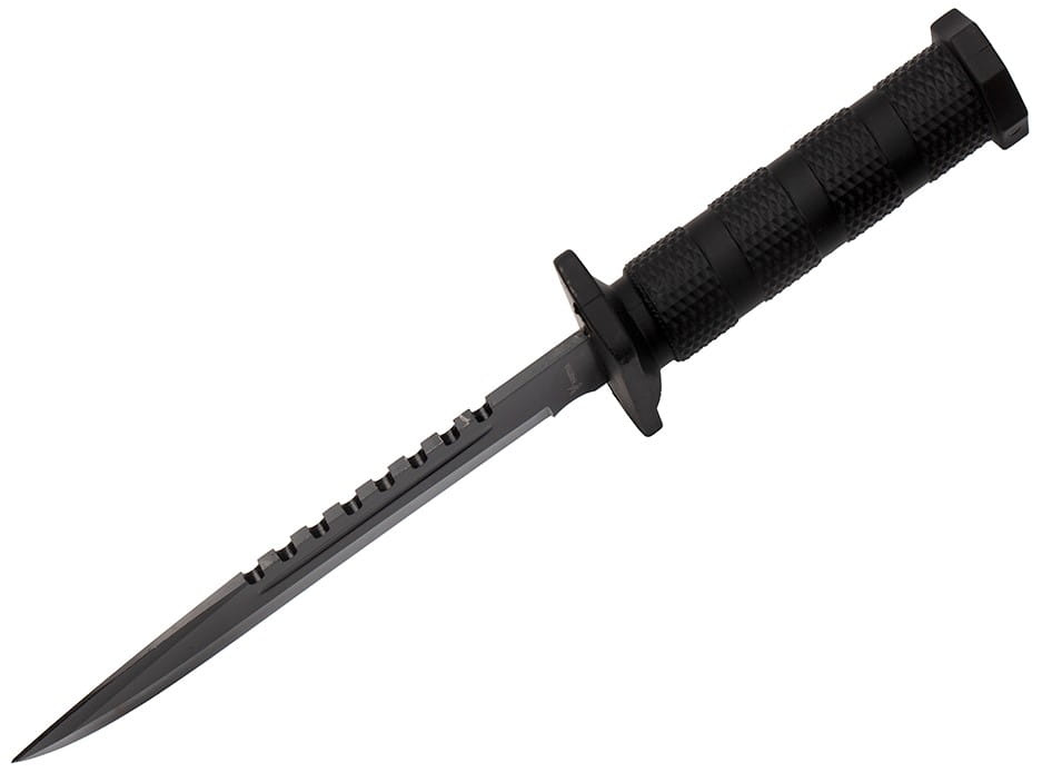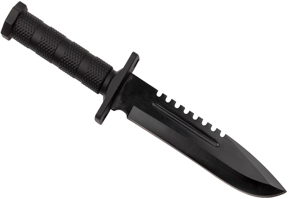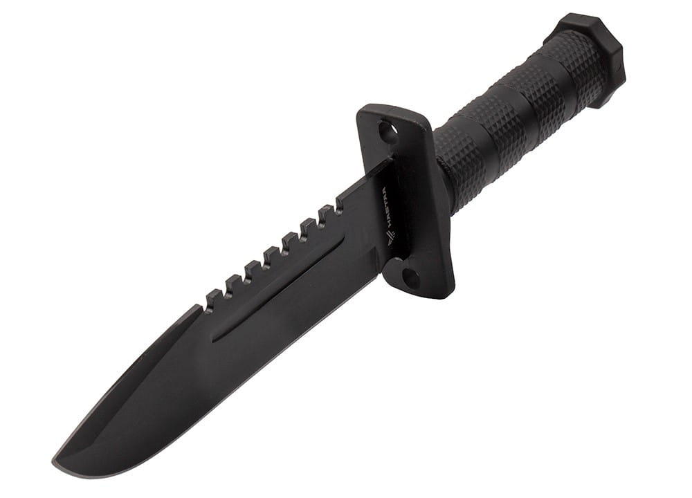Na grzbiecie czarny nóż wojskowy został wyposażony w ząbkowanie, które pełni rolę uniwersalnej piły