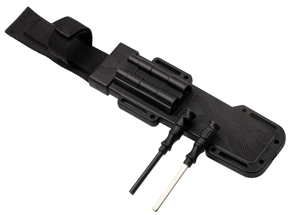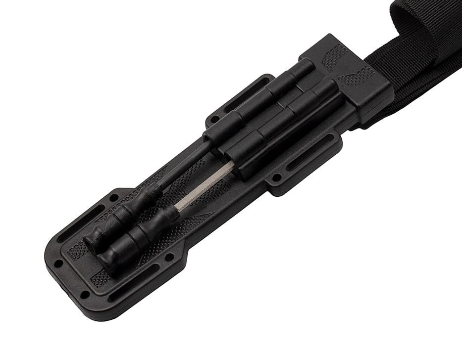 W wielofunkcyjnej pochwie ukryte zostało krzesiwo z gwizdkiem alarmowym oraz niewielka ostrzałka, którą z łatwością naostrzysz nóż w każdej okoliczności.