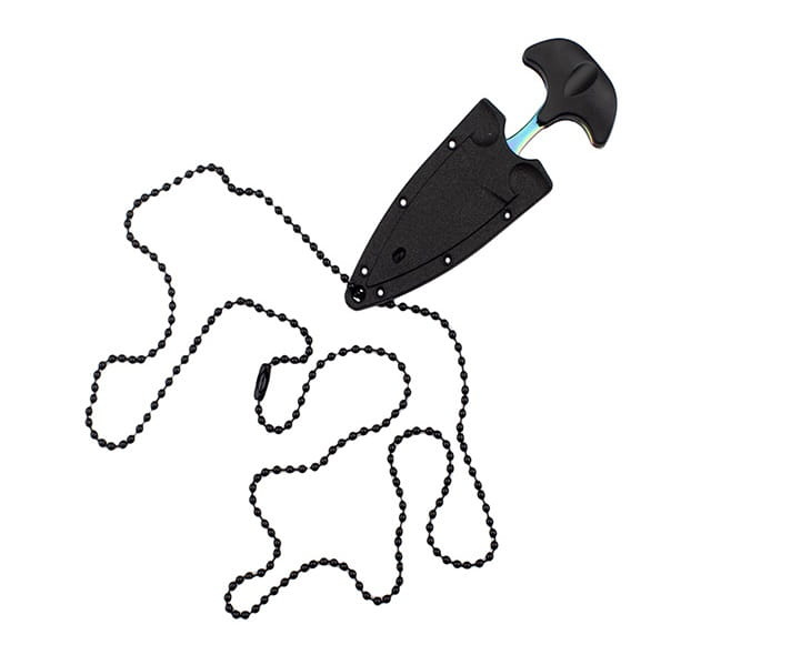 Posiada on także łańcuszek, dzięki któremu można nóż taktyczny powiesić na szyi (neck knife).