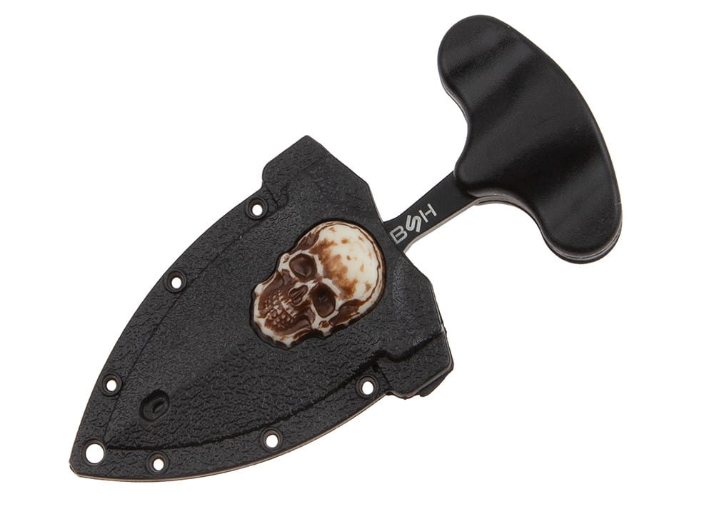 Nóż taktyczny posiada pokrowiec z tworzywa z aplikacją w formie ludzkiej czaszki.
