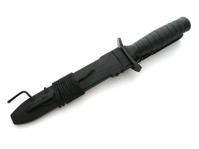 W zestawie znajduje się czarna pochwa z wysokoudarowego tworzywa, która została opleciona dziesięcioma zwojami linki w pasującym kolorze.