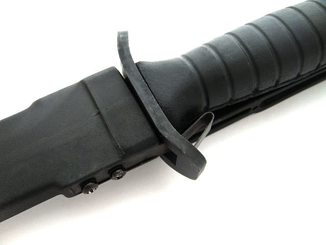 Przed ewentualnym wypadnięciem noża z pochwy chroni metalowa sprężyna blokująca