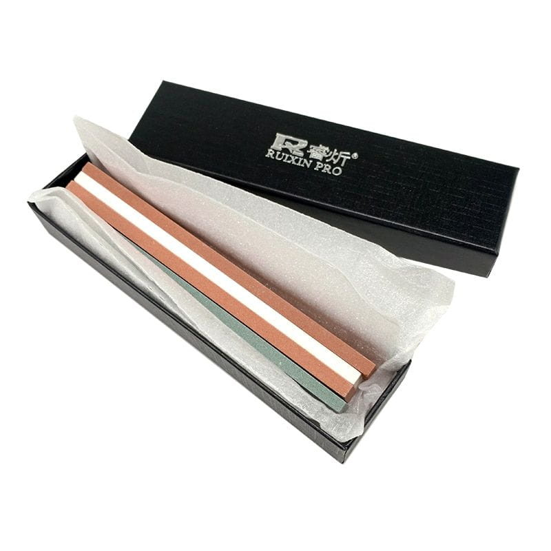 Zawiera kamienne ostrzałki o różnej ziarnistości, dzięki którym możemy uzyskać idealną powierzchnię ostrza.