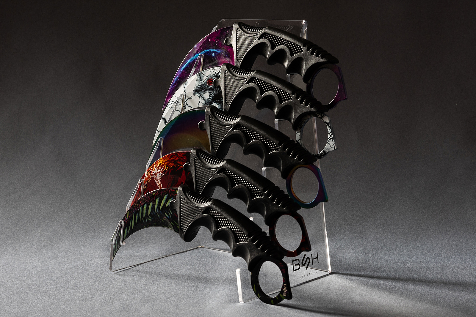 Na stojaku wyróżnia się subtelne logo BSH ADVENTURE, co nadaje mu charakteru i podkreśla przeznaczenie dla miłośników outdooru, survivalu i kolekcjonowania.