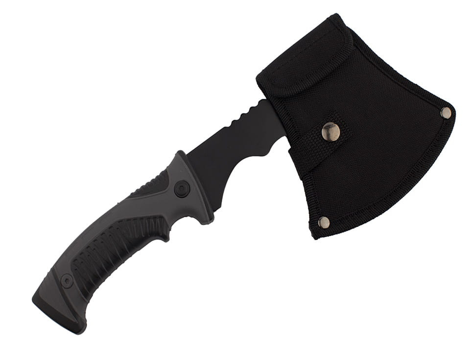 Toporek taktyczny posiada czarny pokrowiec na ostrze, który można przymocować do paska spodni.